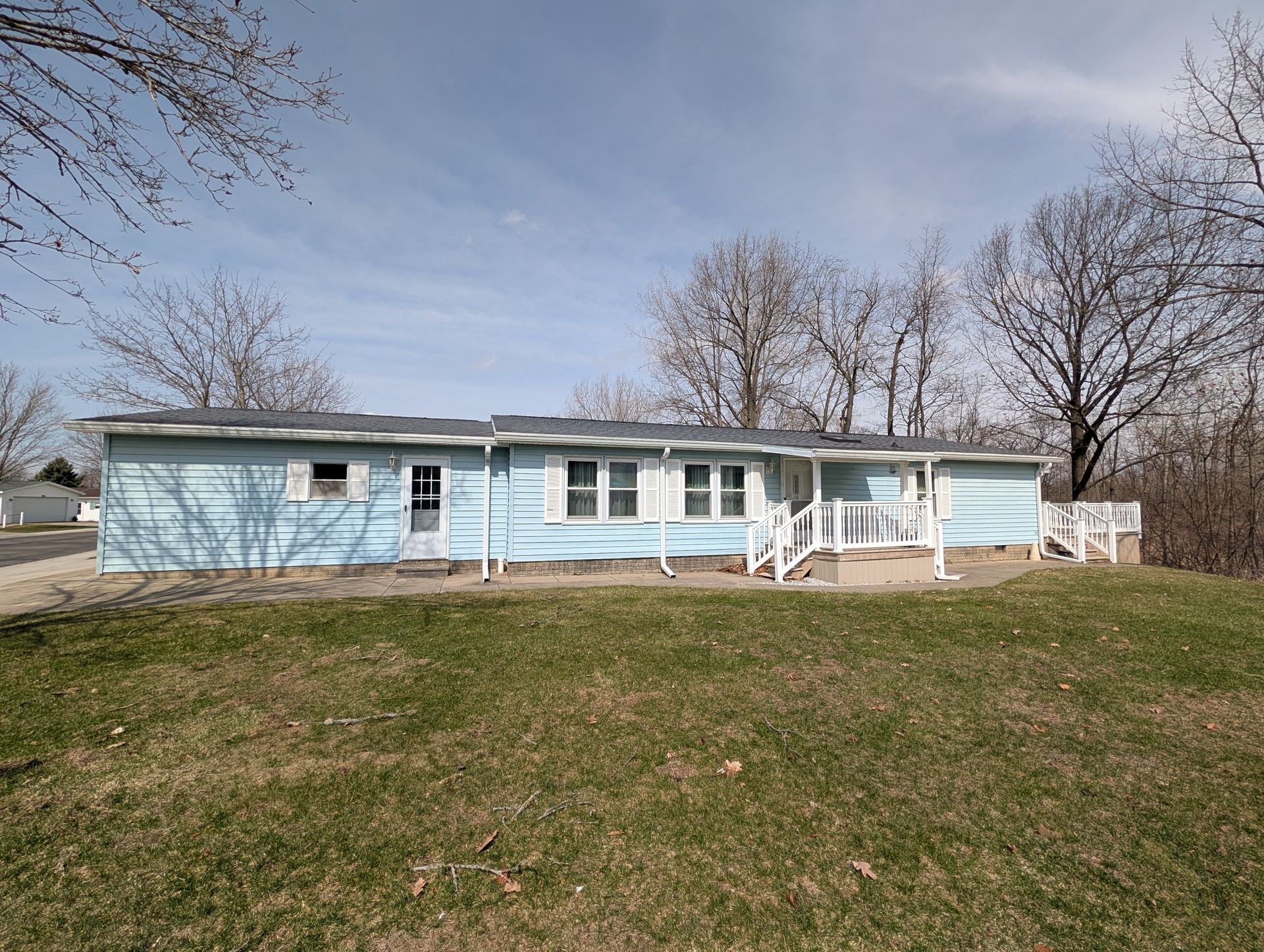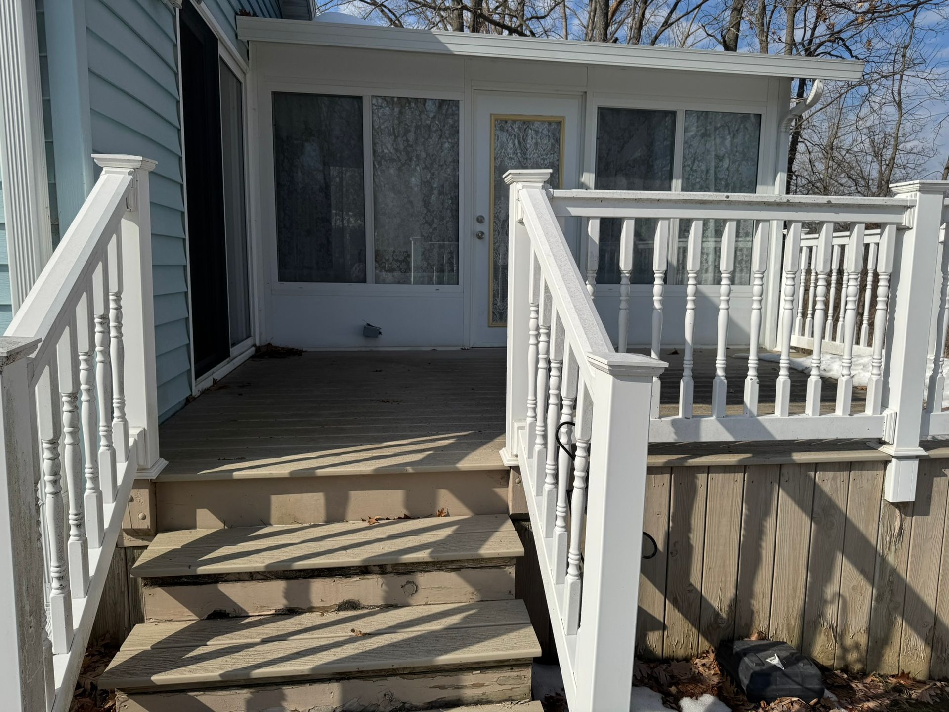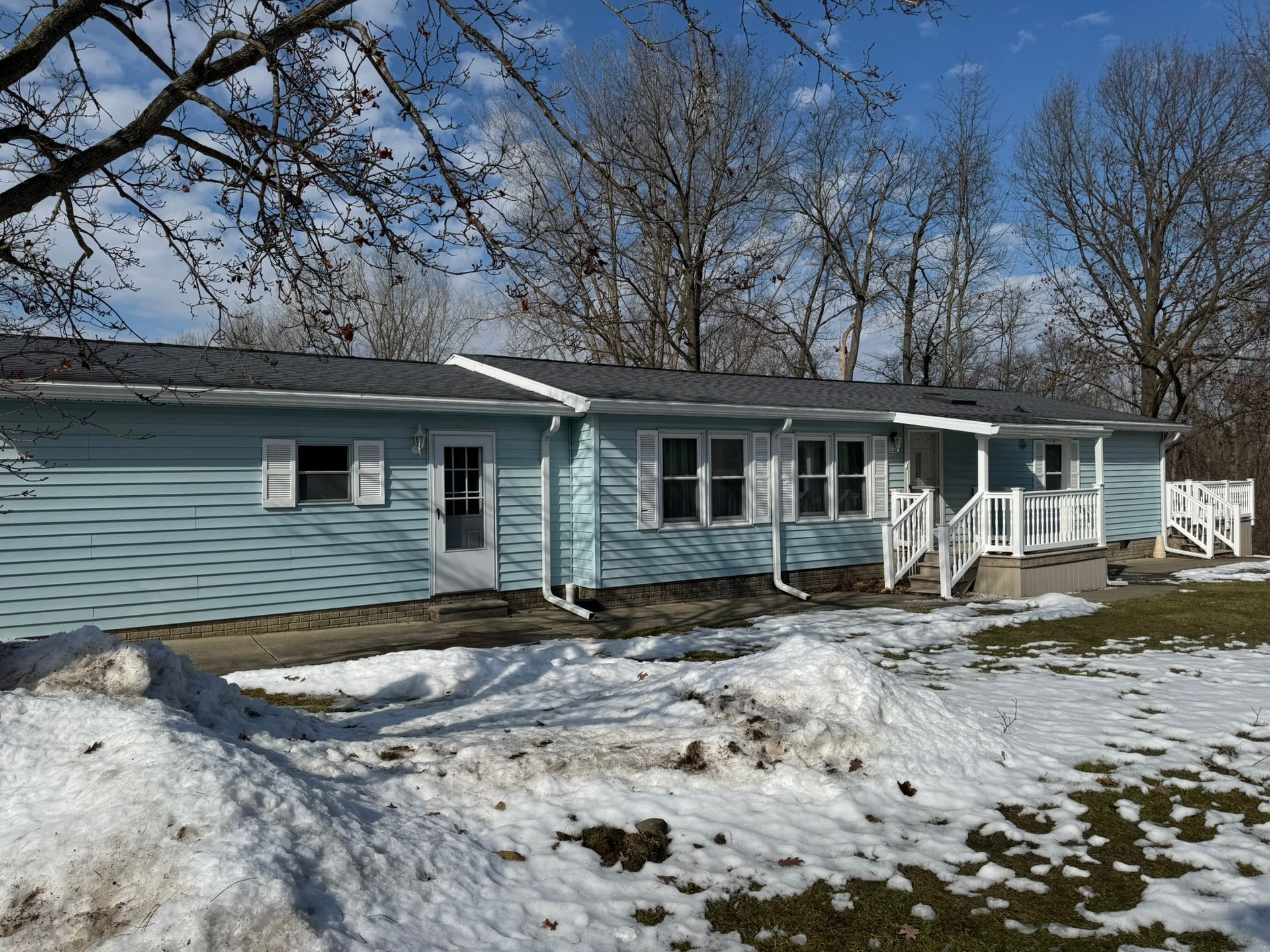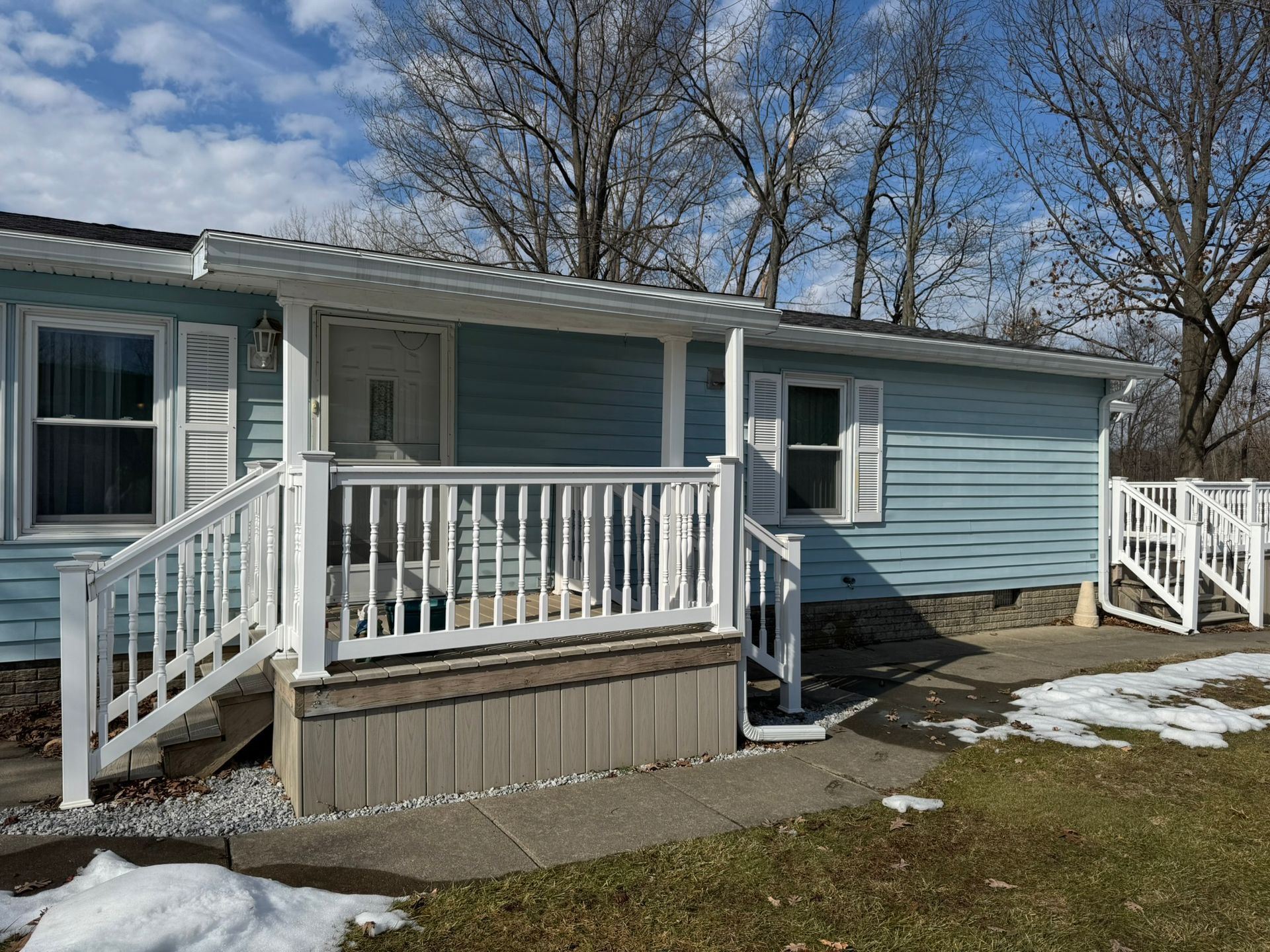 This home features a pretty sunroom with gas stove, composite deck and covered front porch with vinyl rail. Inside you will find a new (2023) walk-in shower in the large primary bedroom and walk-in closet. Dedicated laundry room with newer (2021) washer and dryer. Good sized kitchen with lots of cabinets and dishwasher. Laminate wood flooring in kitchen, dining and hallway. Brand new (2026) garage door is a plus! Garage also features tons of storage closets. Roof replaced in 2008.