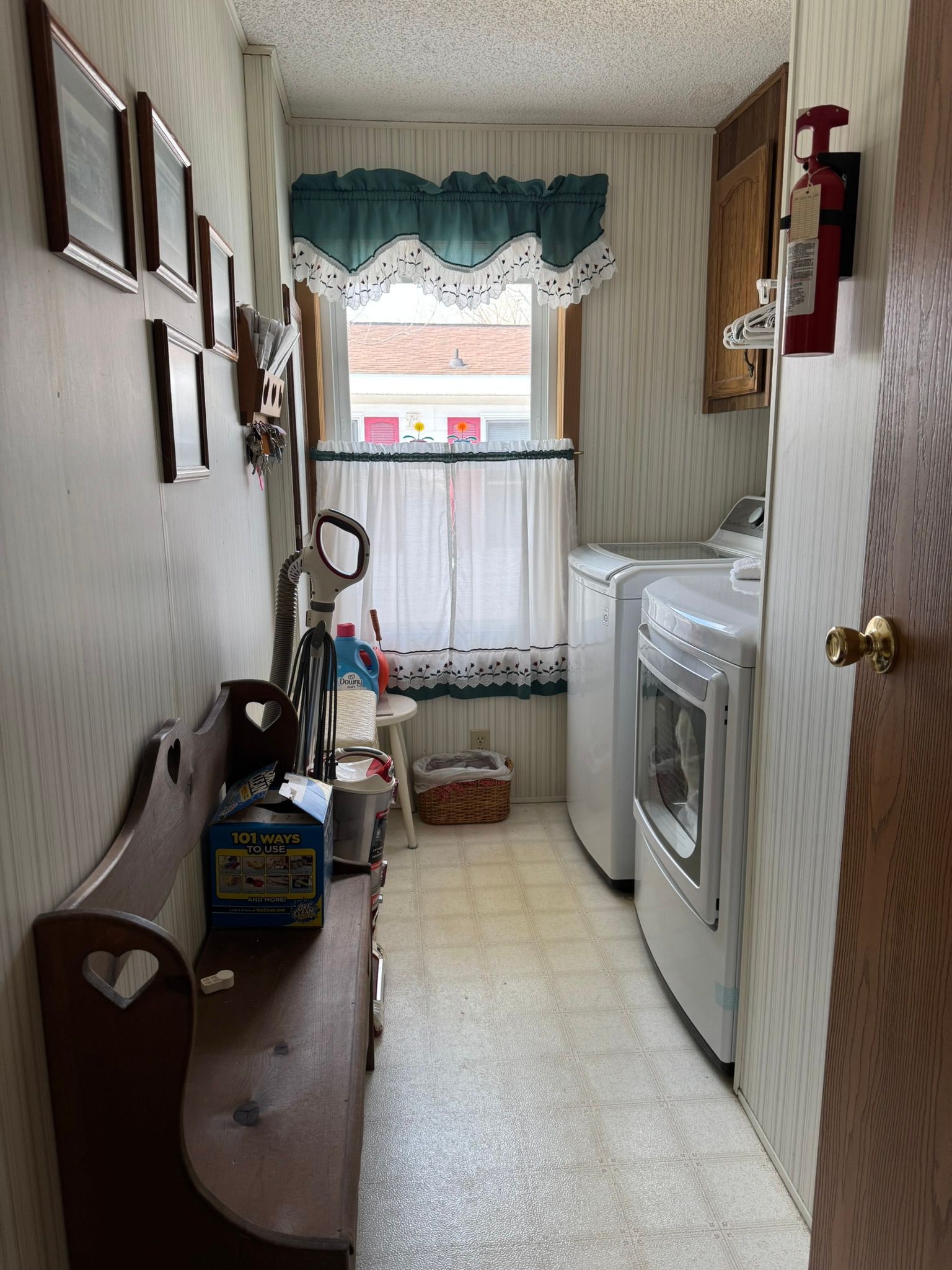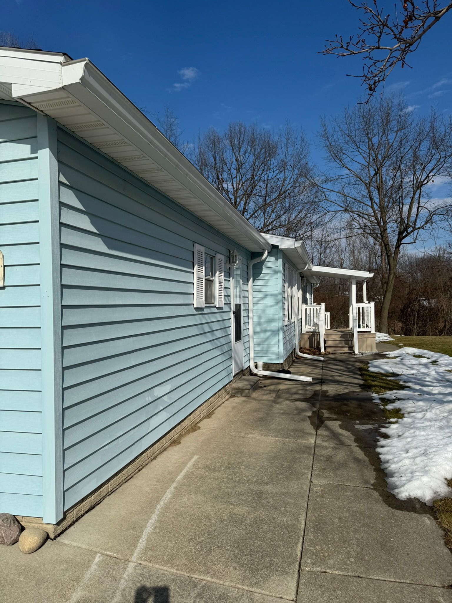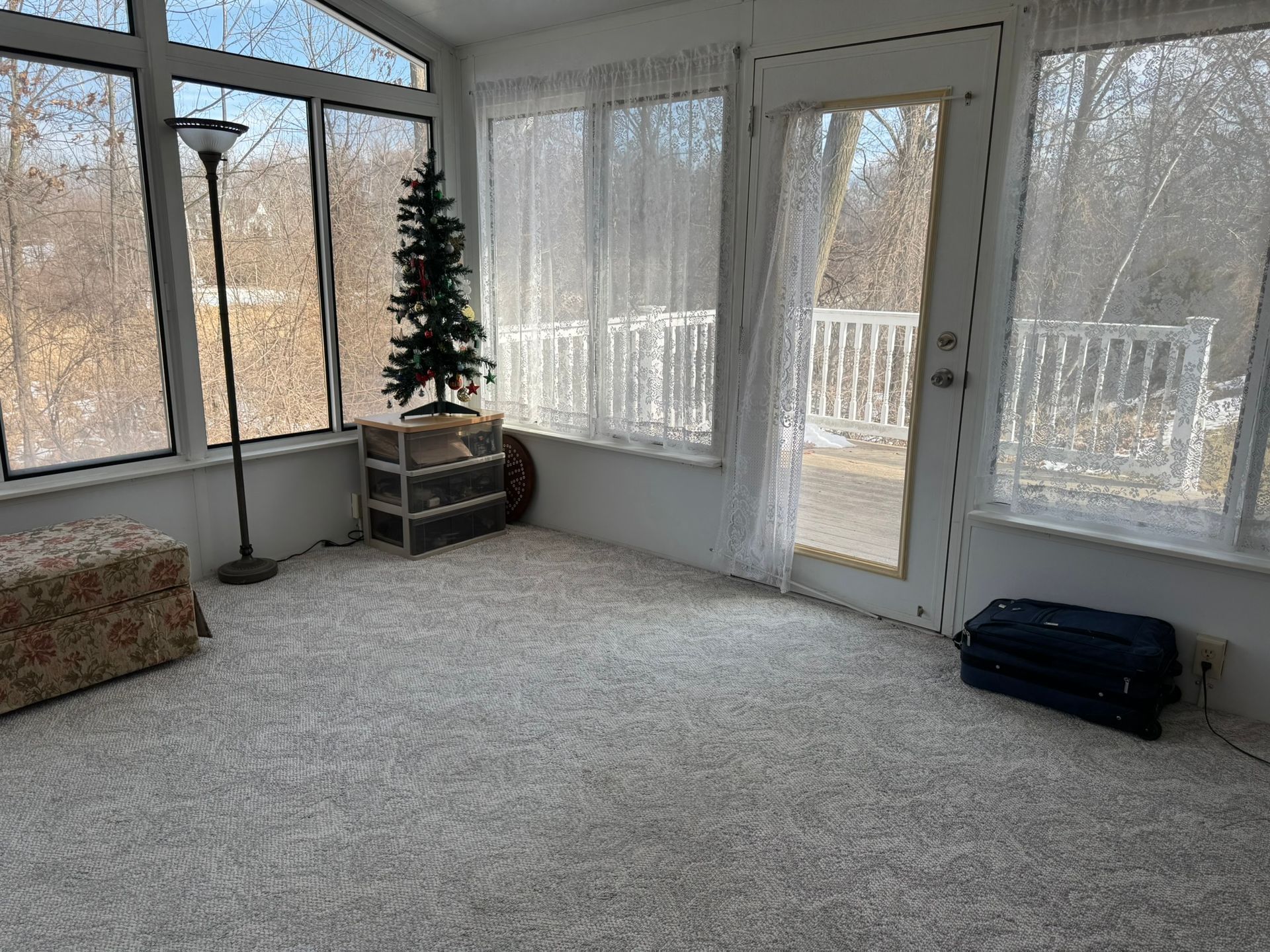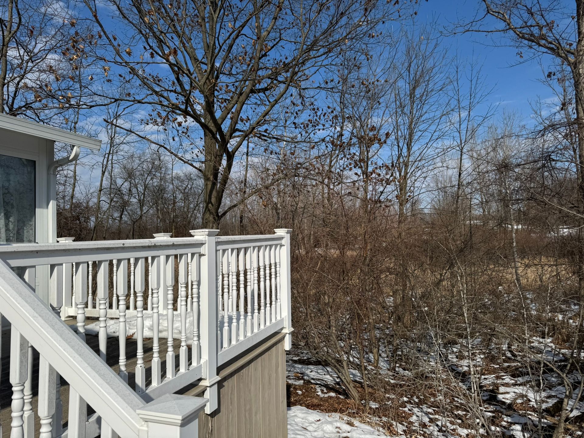 This home features a pretty sunroom with gas stove, composite deck and covered front porch with vinyl rail. Inside you will find a new (2023) walk-in shower in the large primary bedroom and walk-in closet. Dedicated laundry room with newer (2021) washer and dryer. Good sized kitchen with lots of cabinets and dishwasher. Laminate wood flooring in kitchen, dining and hallway. Brand new (2026) garage door is a plus! Garage also features tons of storage closets. Roof replaced in 2008.